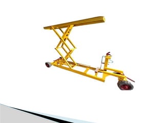 The weapon loading trolley is a specialized device used by the Indian Armed Forces for effectively loading heavy articles and equipment, reaching heights of 500mm from the ground. It features a robust steel construction, a single-stage dual scissor design, and accommodates a lifting capacity of 750 kg, making it cost-effective and low maintenance. The trolley is designed for easy operability and safe loading and unloading of armament stores, including bombs and weapons, for aircraft operations.