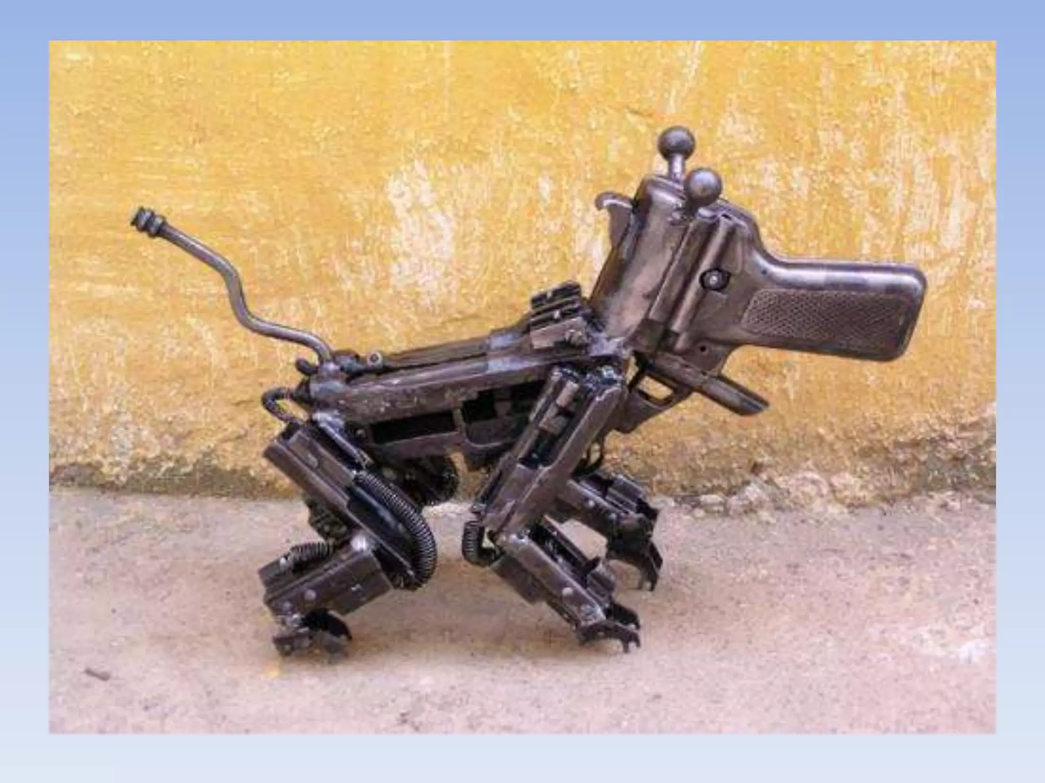 This document provides instructions for a task to create a poster explaining a work of art made from weapons. Students are asked to select a sculpture made with weapons, research its title, artist, date, location, weapons used, and meanings, and translate this information into a poster using postermywall.com. Links to websites about weapon sculptures are provided for research.