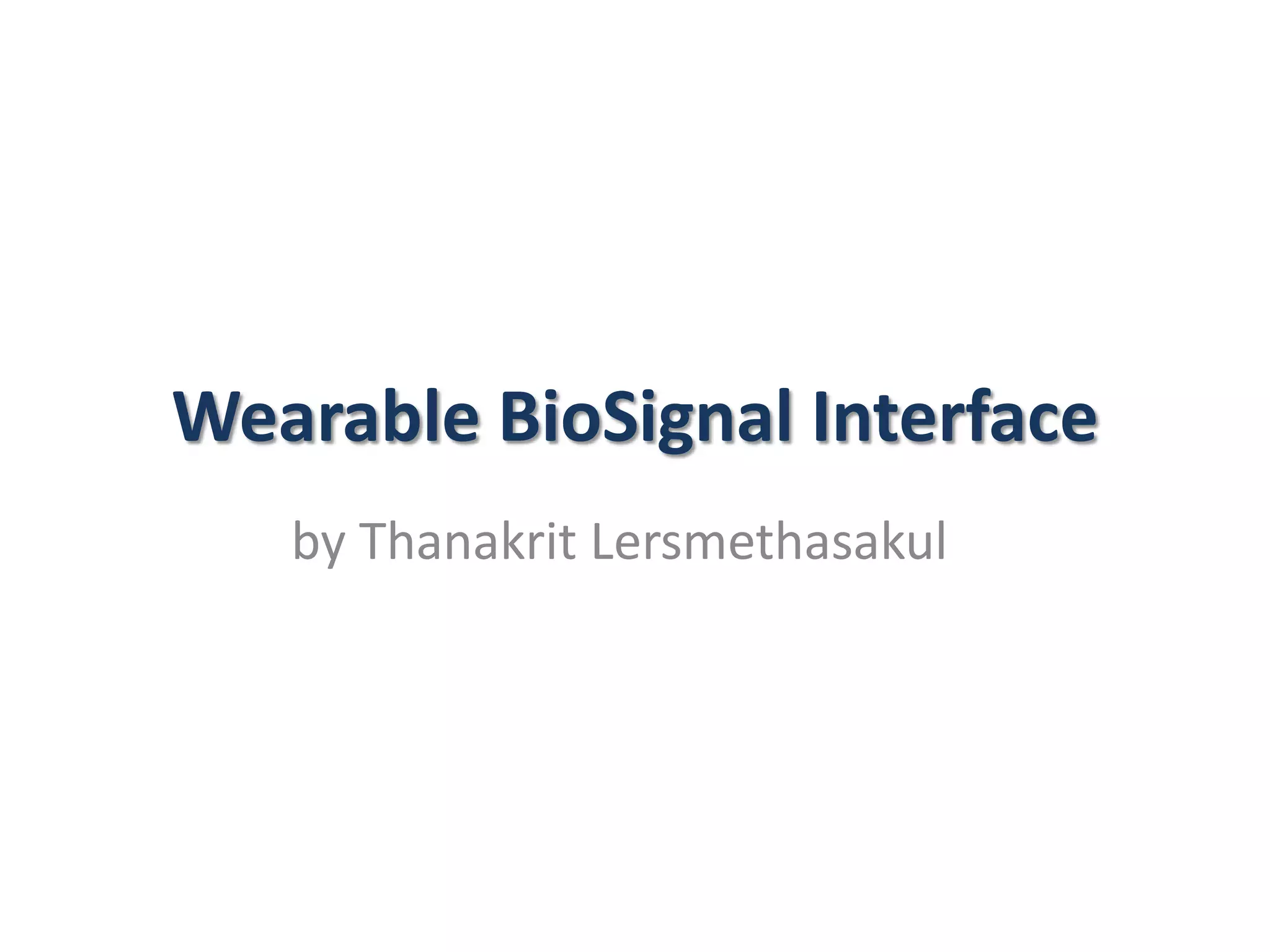 The document presents a study on a wearable biosignal interface aimed at understanding bio-electric signals for device control, emphasizing various classification approaches and literature on brain-computer interfaces. It discusses system architecture, accuracy of pattern recognition, and challenges in emotion classification via EEG data. Key findings highlight the potential for improved classification with neural network architectures, but note limitations due to low accuracy from limited training data.