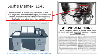 The document outlines research in wearable computer vision, particularly focusing on first-person vision systems that involve localization, understanding, and anticipation of user actions. It discusses contributions to egocentric shopping cart localization and visitor behavior analysis in museums using computer vision and machine learning techniques. Key technologies and benchmarks, including a dataset for action recognition and anticipation, are highlighted along with the implications for enhancing user experience in various environments.
