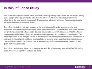 The wearable devices influence study analyzes the impact of brands and products in the wearable technology market, focusing on smart watches, smart glasses, and health products. It identifies key influencers and media outlets driving discussions, revealing that three outlets have a majority share of influence. The study provides insights that can inform marketing strategies and highlights that Samsung leads in influence, while Apple is also a significant player.
