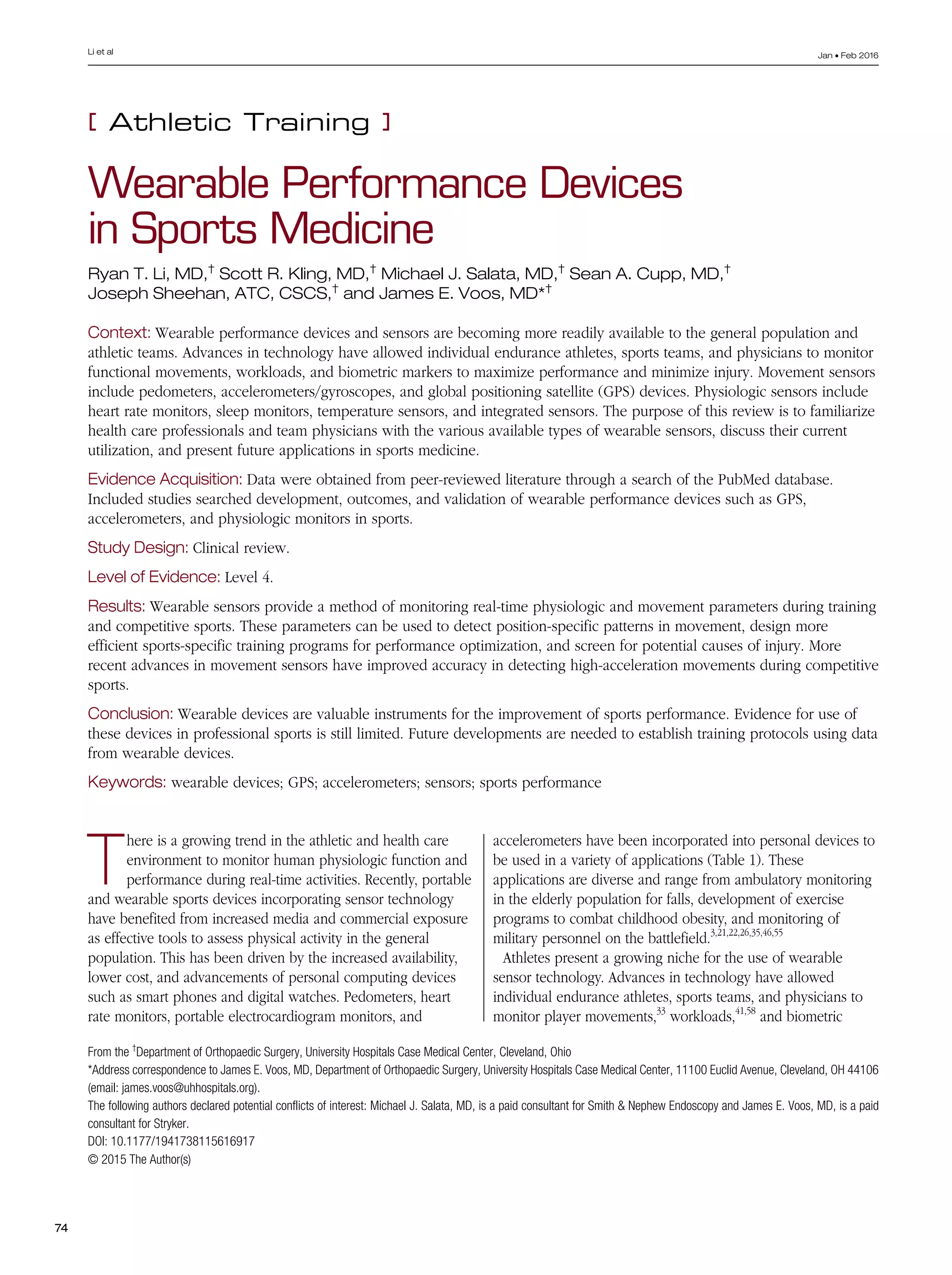 This document discusses the growing use of wearable sensor technology in sports medicine. It describes various types of movement sensors like pedometers, accelerometers, gyroscopes, and GPS that can track athlete movements, workloads, and positions. It also discusses physiologic sensors like heart rate monitors and temperature sensors. The document concludes that wearable sensors provide a method to monitor real-time physiology and movement to optimize performance, detect injury risks, and design efficient training programs.