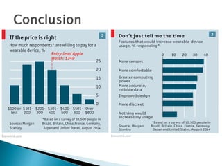 This document discusses wearable devices, their uses, and enterprise applications. It defines wearable technology as clothing and accessories that incorporate computer and electronic technologies. Some key points made are: wearables provide hands-free engagement and connectivity through notifications; over a third of wearables are used in industrial settings like healthcare, technology, and automotive; common wearable technologies include sensors, displays, and rigid or fabric bodies; and examples of enterprise-focused wearables that could benefit businesses are those allowing hands-free use, heads-up displays, connectivity, and integration with the Internet of Things.