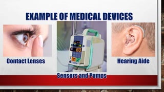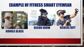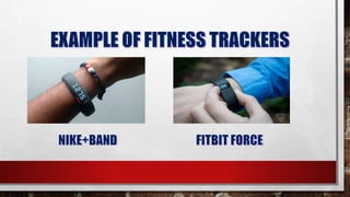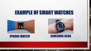 The document discusses the history and examples of wearable technology. It notes that 10 years ago, the coolest technological medium people could wear was early wearable devices like standalone communication devices worn on the wrist. It defines wearable technology as devices specifically designed to be worn that aim to enhance the user's experience seamlessly. Examples mentioned include fitness trackers worn on the wrist or chest, virtual reality headsets, smart clothing, and medical devices.