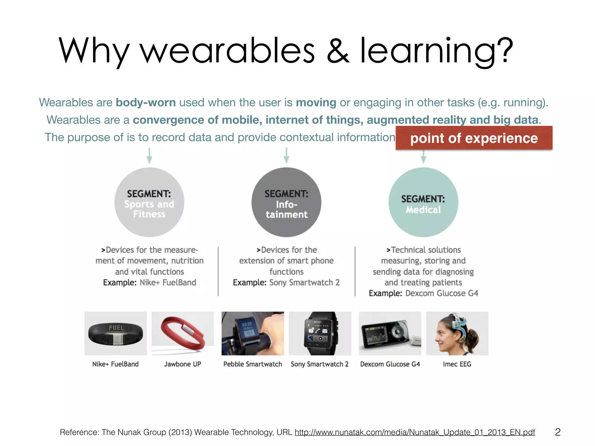 The document discusses the intersection of wearable technology and learning, highlighting its potential to enhance educational experiences. It outlines various projects and research presented at the 11th European Conference on Technology Enhanced Learning, focusing on applications of wearables in different contexts such as vocational training and health. The conference featured numerous tracks and presentations on innovative uses of wearables in education, augmented reality, and user engagement.