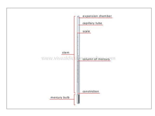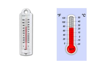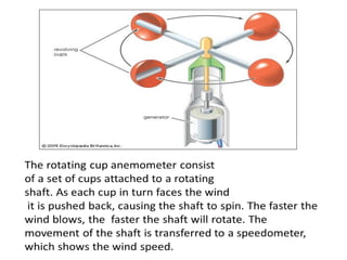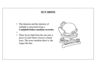 This document outlines the key elements of weather that are measured, including temperature, precipitation, wind, humidity, atmospheric pressure, sunshine, and cloudiness. It describes the instruments used to measure each element, such as thermometers for temperature, rain gauges for precipitation, wind vanes and anemometers for wind, hygrometers for humidity, barometers for pressure, a Campbell-Stokes recorder for sunshine, and estimation of cloud cover in oktas. It provides details on how each instrument is used and constructed to gather weather data.