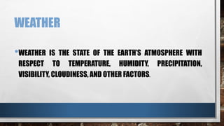This document describes various instruments used to measure weather conditions and elements. It discusses anemometers and wind vanes for measuring wind speed and direction, barometers for atmospheric pressure, rain gauges for rainfall amounts, thermometers for temperature, and hygrometers and psychrometers for humidity. Other instruments mentioned include ceilometers, evaporation pans, thermohygrographs, Stevenson screens, and Campbell-Strokes sunburn tracers. The document provides brief descriptions of each instrument and how it is used to collect weather data.