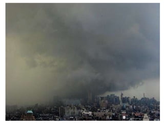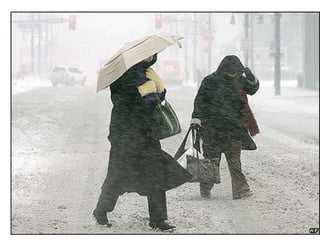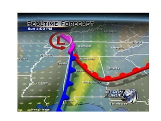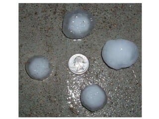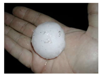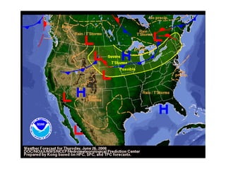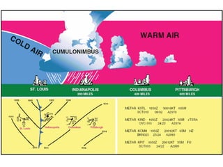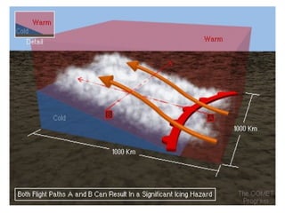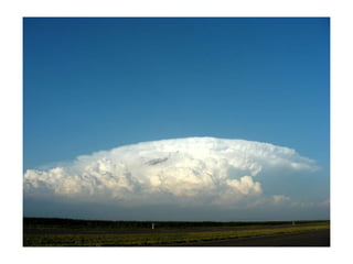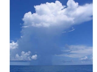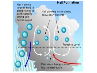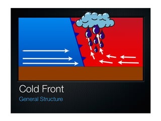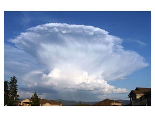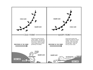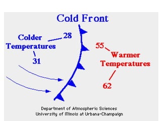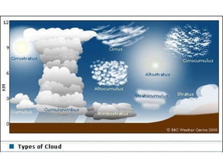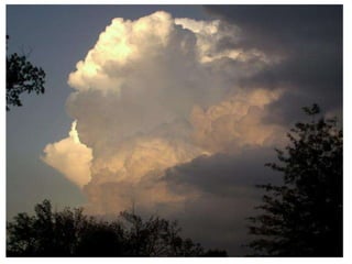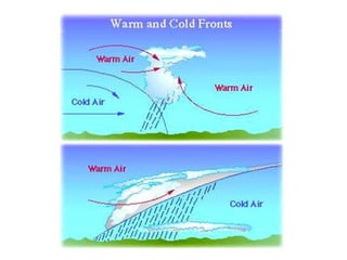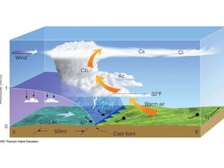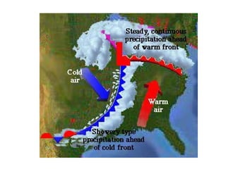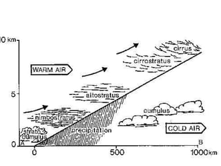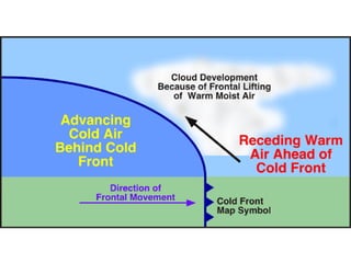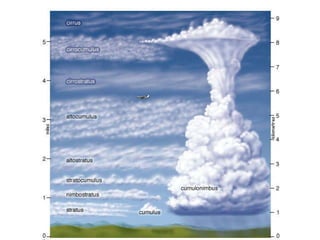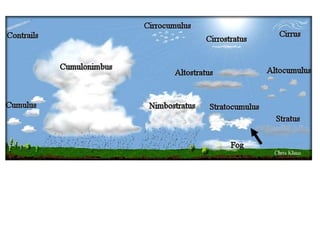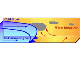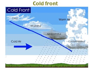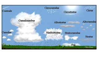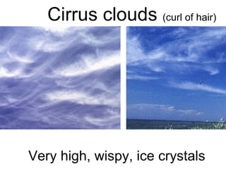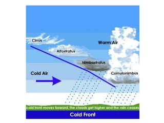 Cirrus clouds are very high and wispy ice crystals. Cumulus clouds are mid-level fluffy lumps of condensed vapor. Stratus clouds are layers of condensed vapor. Nimbus clouds are clouds that may cause precipitation. Cumulonimbus clouds are very tall and fluffy clouds that can cause heavy rains. When a cold front collides with a warm front, the warm moist air is pushed upwards.