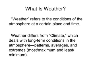This document discusses how weather is observed and measured. It explains that weather refers to atmospheric conditions at a specific place and time, while climate deals with long-term patterns. It then describes the key variables that are measured, including temperature, pressure, wind, moisture, clouds, and precipitation. Common instruments for observing each variable are presented, as well as how weather data is represented in station models. The document concludes by noting the importance of upper-air and remote sensing data from weather balloons, satellites, and radar.