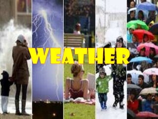 The document defines key terms related to weather and climate such as weather, climate, season, temperature, humidity, air pressure, and winds. It describes how weather is the short term atmospheric conditions of a place while climate refers to average conditions over a longer period. Seasons result from the Earth's revolution and axis tilt. Temperature, precipitation, air pressure, winds, and visibility are the main elements that determine weather and climate in a given place. Factors like heat, air pressure, winds, and moisture interact to cause weather. Major wind systems like the doldrums, trade winds, horse latitudes, and prevailing westerlies result from differences in heating and the Coriolis effect.