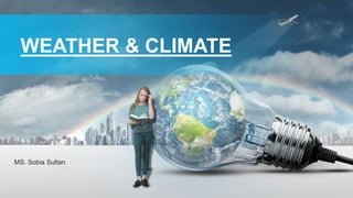 This document discusses weather and climate, defining weather as day-to-day conditions like temperature, precipitation, while climate refers to average weather conditions over a long period of time. It outlines four main factors that affect climate: distance from the equator, altitude, rainfall, and proximity to the sea. Places near the equator tend to be warm and wet, higher altitudes are cooler, rainfall and the monsoon affect growth, and coastal areas experience sea breezes. Pakistan's climate zones include highlands, arid, coastal, and semi-arid regions due to its location and monsoon winds.