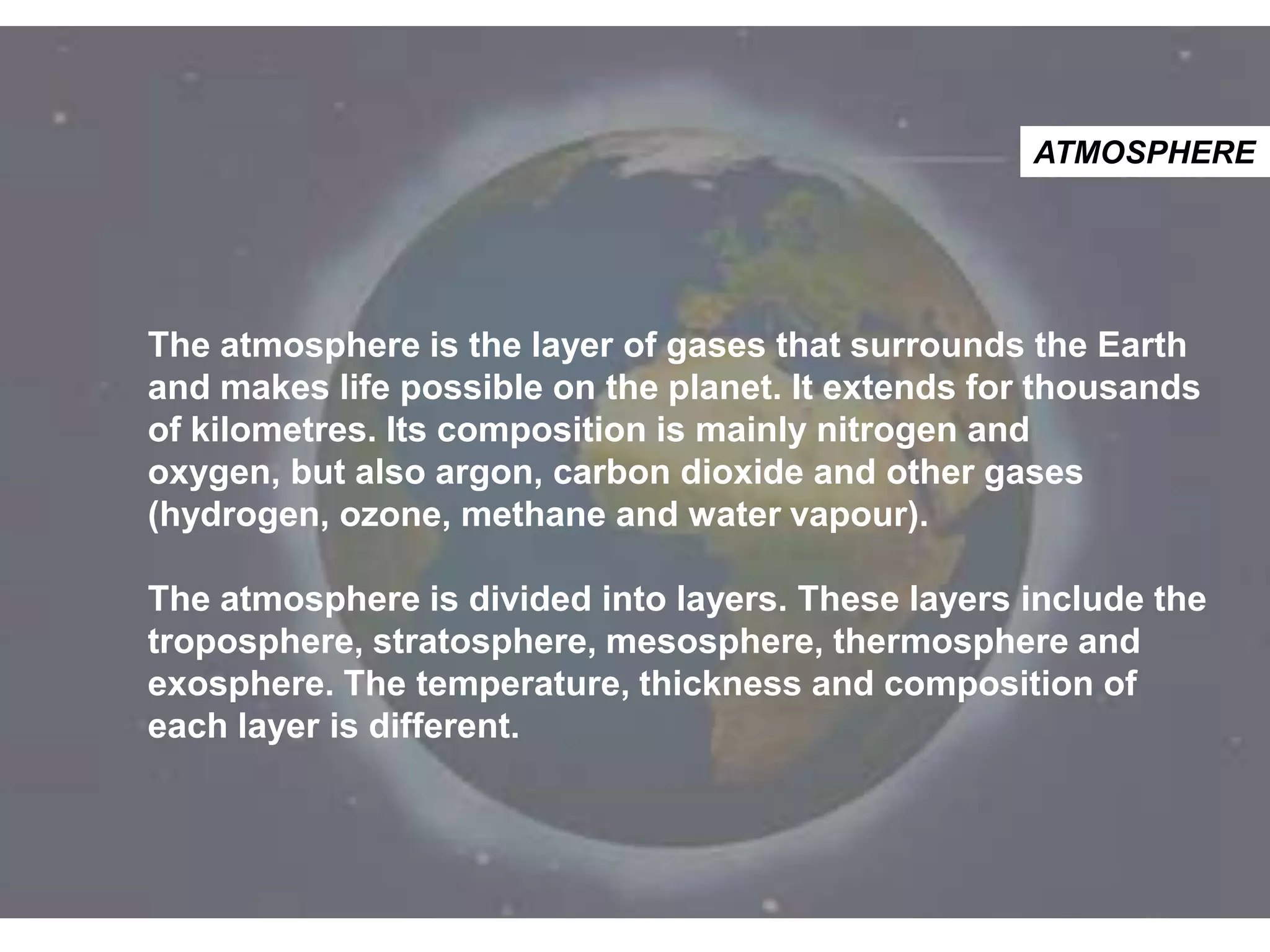 1) The atmosphere is the layer of gases surrounding the Earth that makes life possible. It is mainly composed of nitrogen and oxygen and extends thousands of kilometers above the Earth's surface.