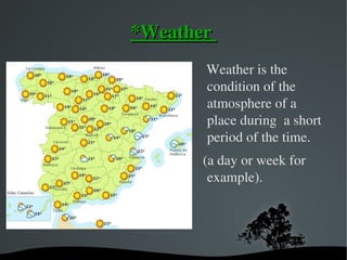 Weather refers to atmospheric conditions over short periods, while climate describes conditions over many years. Climate generally depends on proximity to the equator, altitude, and influence of seas - regions near the equator, at lower elevations, or closer to seas tend to have warmer climates. Spain's climate includes Atlantic, Continental, Mediterranean, Continental-Mediterranean, Mountain, and Subtropical types.