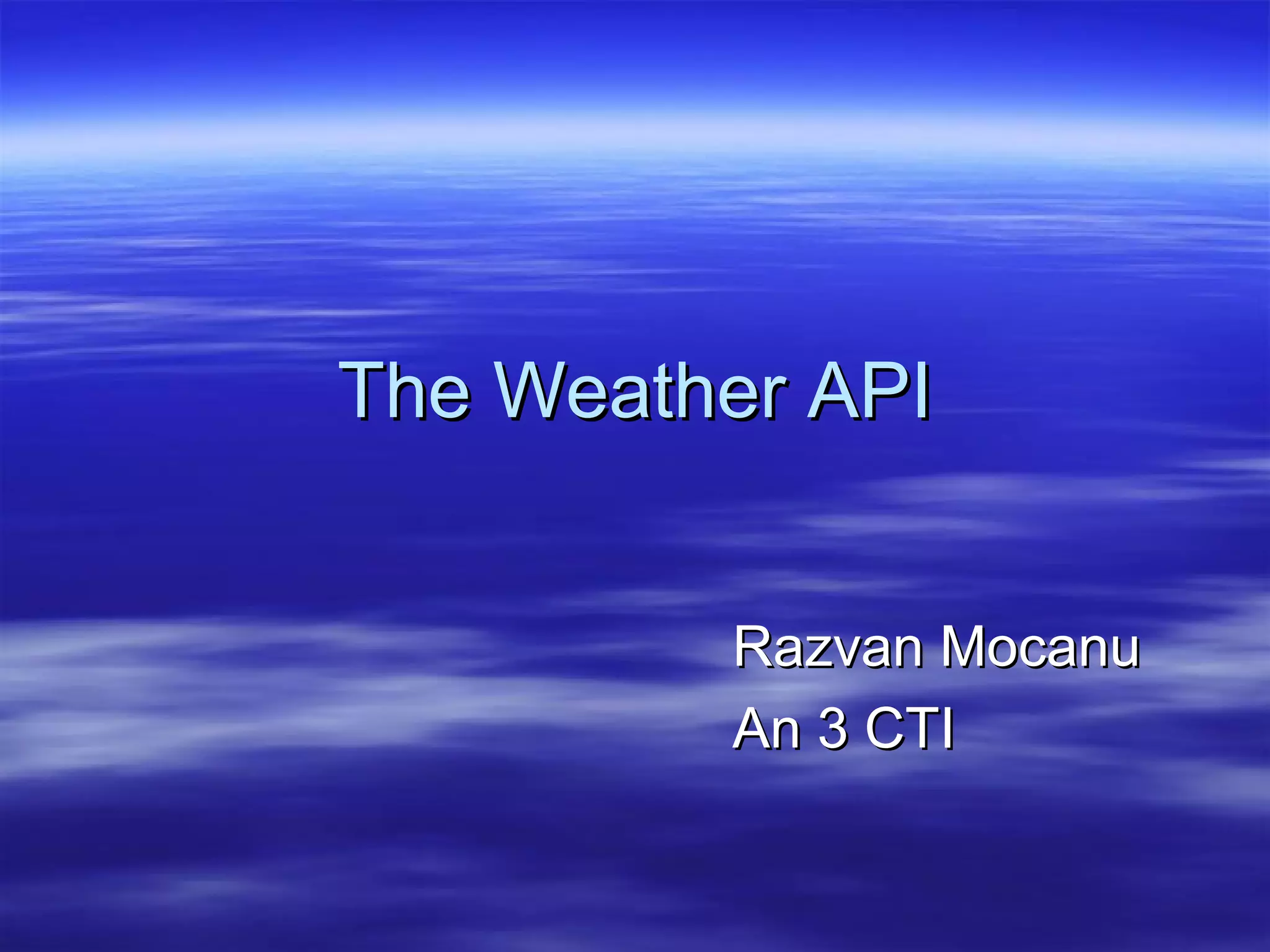 The document discusses using the Open Weather API and Google Maps API to obtain real-time weather and location data from around the world. It describes how the APIs can be combined or "mashed up" to search for weather conditions by city name, including temperature, humidity, wind speed, and atmospheric pressure. Resources listed at the end provide documentation and examples for working with the Open Weather and Google Maps APIs.