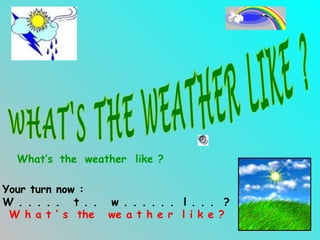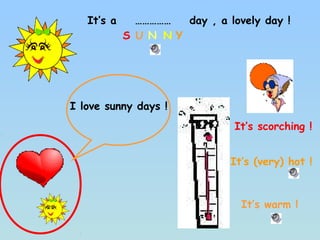 The document discusses different types of weather including sunny, rainy, windy, snowy, foggy and cloudy days. It provides vocabulary for describing the weather like hot, warm, cold, and freezing. Various phrases are presented for talking about the weather such as "It's raining cats and dogs" and "A sunshiny shower won't last half an hour." BBC weather symbols and saying about weather predictions are also mentioned.