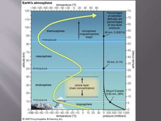 This document summarizes key concepts about atmospheric pressure and weather patterns. It explains that high and low pressure centers drive wind patterns due to differences in air pressure. Air rises at low pressure centers and sinks at high pressure centers. The document also outlines different types of fronts where different air masses meet, including cold, warm, occluded, and stationary fronts. It describes cloud formation and types of clouds like cumulus, stratus, and cirrus clouds. Finally, it discusses severe weather events like thunderstorms and tornadoes that form from conditions including humidity, heat, unstable air masses, and lifting mechanisms like fronts.