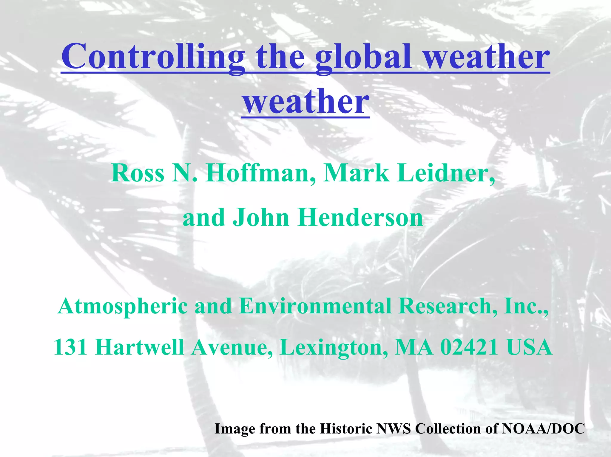 The document discusses the possibility of controlling global weather through small, precise perturbations to the atmosphere. It describes how the chaotic nature of the atmosphere implies sensitivity to small changes and suggests a series of small perturbations may control weather evolution. It outlines components a global weather control system may have, including advanced numerical weather prediction, satellite sensing, and methods to introduce perturbations. It also presents an experiment using data assimilation to calculate perturbations needed to slightly alter a hurricane's track as a proof of concept.