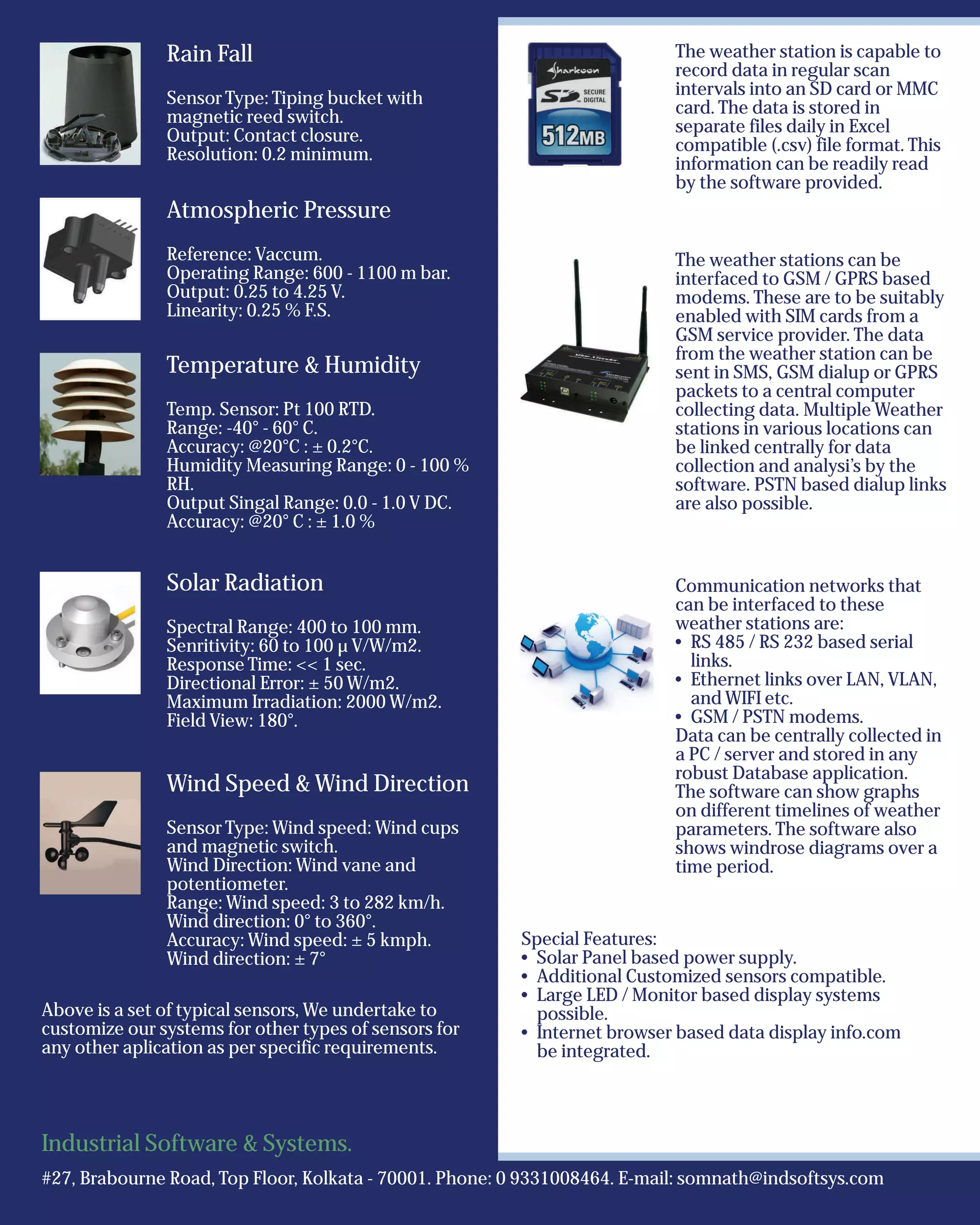 The document details a weather logger capable of recording various atmospheric data such as temperature, humidity, and wind speed, which can be stored in Excel-compatible files and accessed via GSM or GPRS communication. It features multiple sensor types, customization options, and allows for centralized data collection and analysis across various locations. The system provides a user-friendly software interface for visualizing data and includes options for additional sensors and display systems.