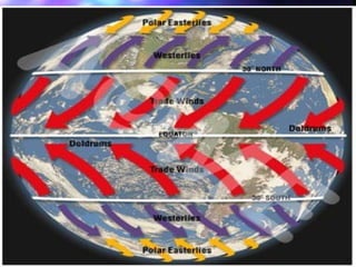 Weather is the current state of the atmosphere. It can be gentle or fierce, bringing life or death. Various cultures have different names for weather phenomena like wind. Weather results from uneven heating of the Earth's surface, which causes warm air to rise and cold air to sink, driving global wind patterns. Local winds are caused by differences in land and sea temperatures. Air pressure, temperature, humidity, and wind speed all factor into weather conditions. Clouds form when water vapor condenses, and different cloud types signal upcoming weather. Weather maps depict fronts where air masses meet, indicating precipitation and storms.