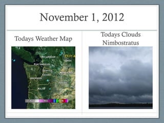 The document is a weather journal for November 2012, detailing daily weather observations including cloud types, temperatures, precipitation, humidity, and barometric pressure. It highlights variations in weather conditions, with many overcast days and instances of rain, alongside temperature fluctuations ranging from the low 30s to mid-60s Fahrenheit. The journal also provides URLs for additional weather resources.