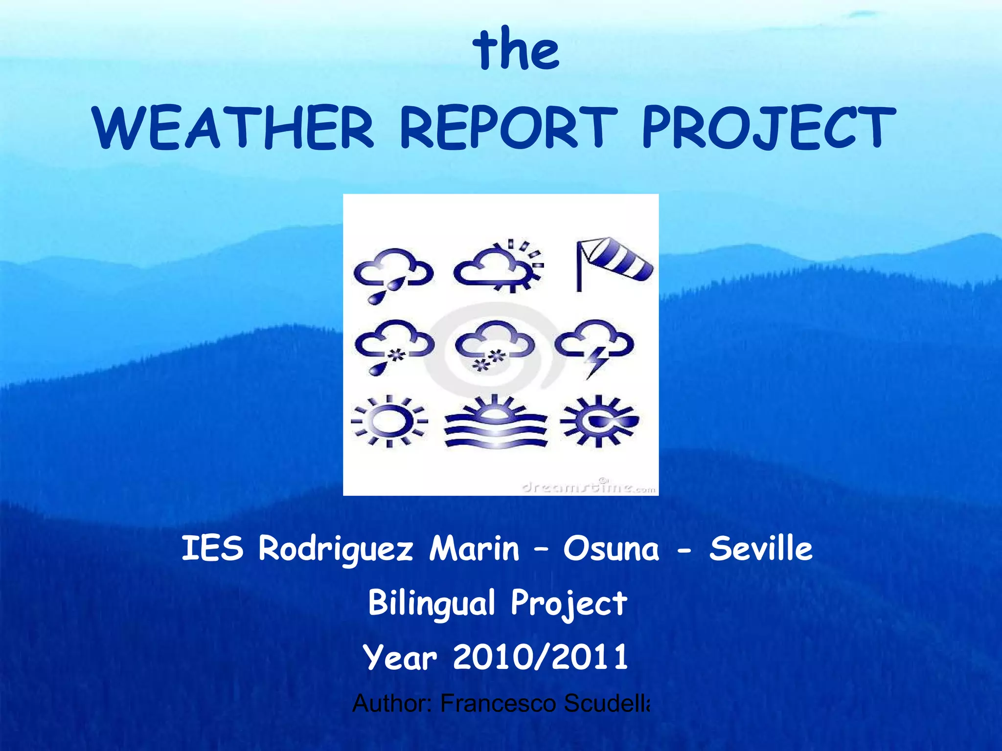 The document provides instructions for a weather report project where students will research and present on the climate of different countries. It explains that students will be split into groups, each researching the climate of a chosen country by finding its basic facts, temperature and rainfall averages in different regions, and type of climate. It offers resources for research and advises including pictures to make the presentations more engaging. Groups must present on an English-speaking country.
