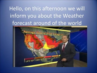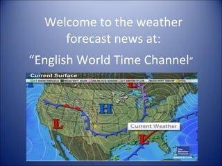 The document provides a global weather forecast report from the English World Time Channel. It notes that global warming has increased 2 degrees according to Greenpeace and weather organizations. Extreme weather events are occurring worldwide, including damage from a tsunami in Somalia, expected lightning storms in Los Angeles, and tornadoes in Southwest Texas. Satellite images show new hurricane formation. While conditions will be sunny in Brazil, Sweden will see rain and rainbows. Mexican beaches are recommended for vacations.