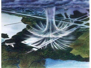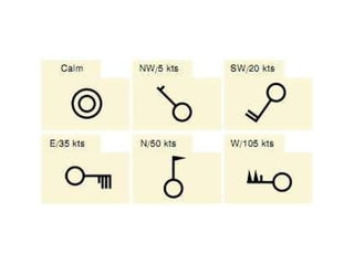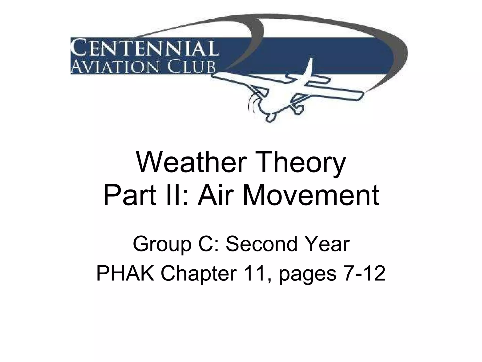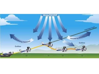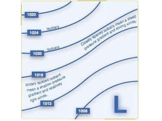 This document summarizes key concepts about air movement and wind patterns. It discusses how air always strives for equilibrium and moves from high to low pressure areas. It defines the differences between wind (horizontal air movement) and currents (vertical air movement). It also explains concepts like anti-cyclonic and cyclonic circulation, areas of high and low pressure, convective currents, land and sea breezes, mountain turbulence, low-level wind shear, microbursts, and how to read surface weather maps.