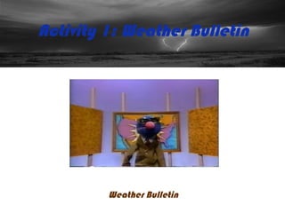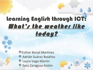 This document contains activities for students to learn English vocabulary related to weather. It includes exercises where students check the weather, discuss weather conditions and plans in their town through email exchanges, and review weather vocabulary in a game. The goal is for students to practice describing weather and making plans based on conditions.