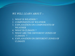 This document discusses weather, climate, and adaptations. It defines weather as the current state of the atmosphere and lists its main components as temperature, humidity, cloudiness, precipitation, wind, and atmospheric pressure. It then defines climate as the average weather conditions in an area over a long period of time. The document outlines different climate zones including alpine, subtropical, tropical, and arid. It defines adaptations as traits that help animals survive in their environments, separating them into structural and behavioral categories. Examples of structural and behavioral adaptations are provided for polar bears, penguins, and red-eyed frogs and how they are suited to their polar or tropical habitats.
