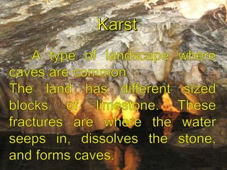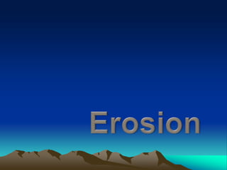 Weathering is the breaking down of rocks into smaller pieces through mechanical or chemical processes. Mechanical weathering breaks down rocks physically through processes like ice wedging or plant root growth, while chemical weathering involves chemical breakdown through reactions with water, carbon dioxide, oxygen, or acids. Both types of weathering occur in place, while erosion is the movement of rock and sediment by agents like wind, water, ice or gravity. Erosion transports weathered material and further shapes the landscape over time.
