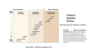 - Goldich's weathering sequence predicts that minerals formed under higher temperatures and pressures are less stable at the earth's surface than low-temperature minerals. The sequence follows Bowen's reaction series, with early-crystallizing minerals weathering first.