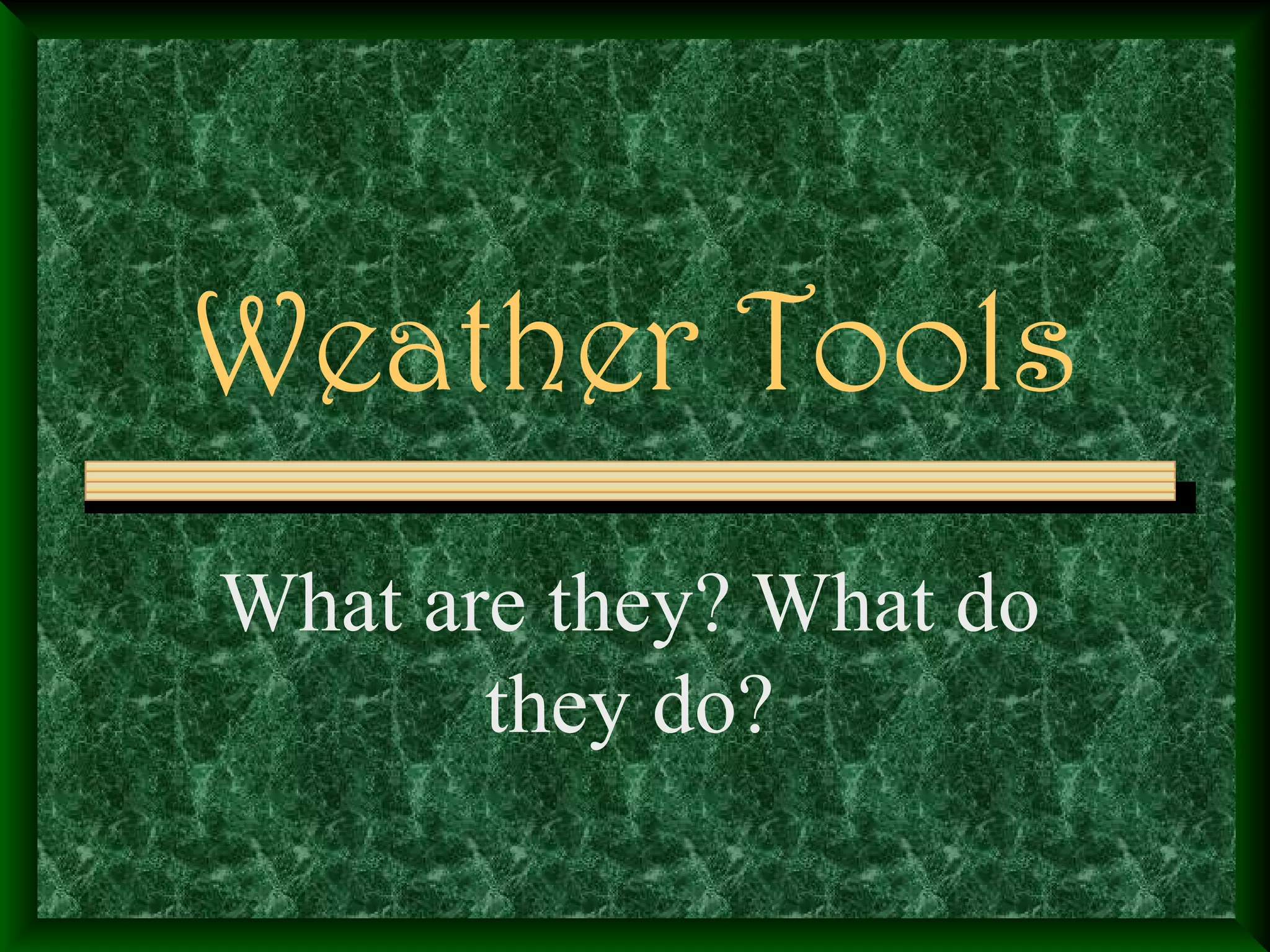 This document discusses common weather tools, including thermometers for measuring temperature, wind vanes for determining wind direction, anemometers for measuring wind speed, barometers for air pressure readings that can predict weather, and rain gauges for collecting rainfall measurements. Each tool plays an important role in weather observation and prediction by providing key data points about temperature, wind, pressure, and precipitation.