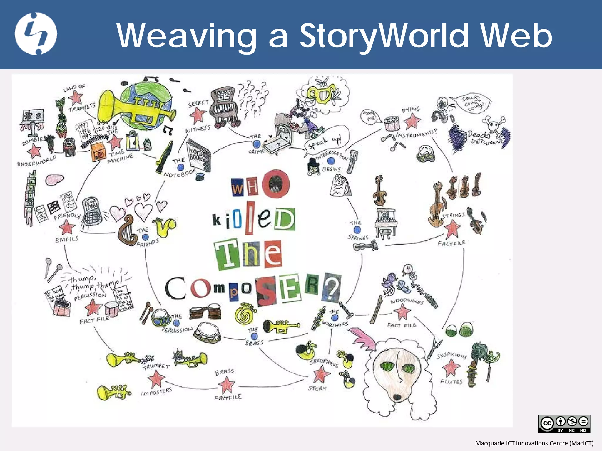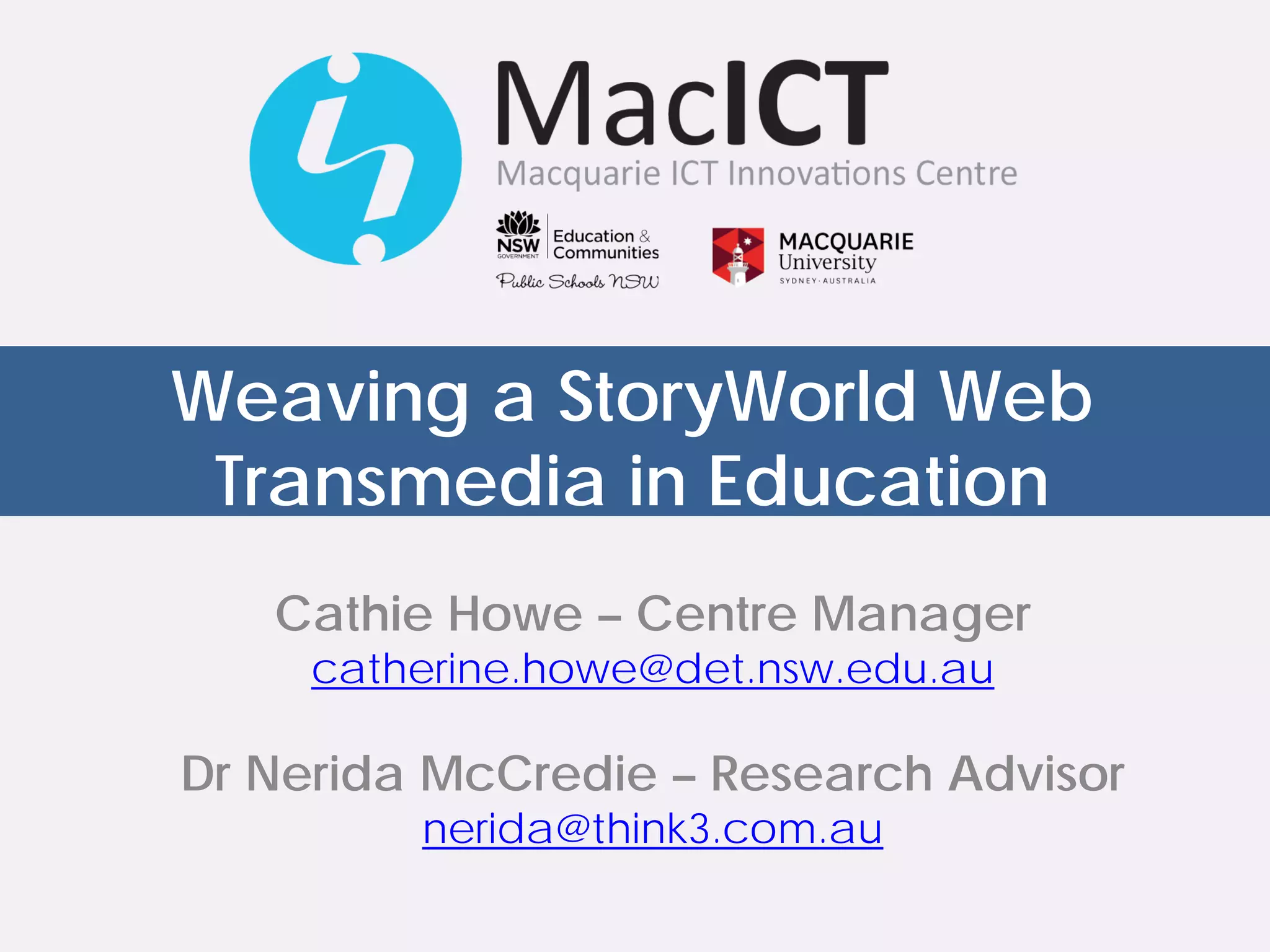 The document discusses the 'Weaving a Storyworld Web' project by the Macquarie ICT Innovations Centre aimed at using transmedia storytelling in education to enhance literacy learning. It outlines a structured framework for students to create multimodal components that extend traditional narratives, allowing them to engage deeply with stories through mining, partnering, and dreaming. The project demonstrates how transmedia can provide diverse learning opportunities by involving students in collaborative storytelling across multiple media platforms.