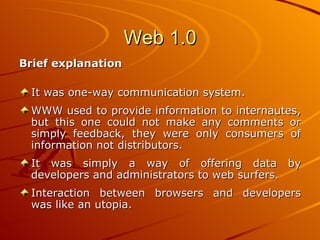 Web 1.0 allowed one-way communication where users could only consume information. Examples included encyclopedias that did not allow user contributions.