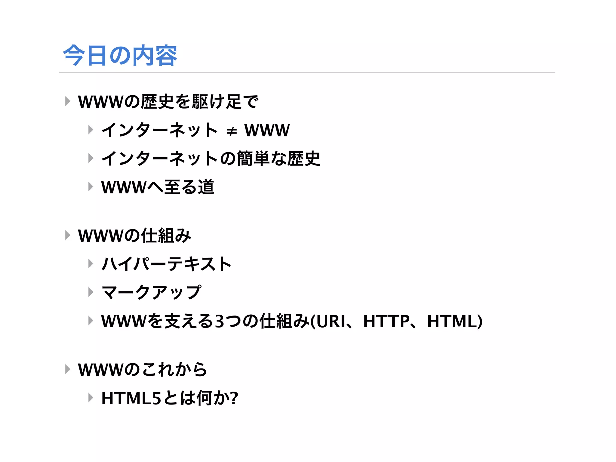 URL) ‣ Uniform Resource Identifier ‣ ネットワーク上の情報を一意に特定するアドレス指定方法 ‣ HTTP ‣ HyperText Transfer Protocol ‣ コンピュータ同士が情報をやりとりするルール ‣ HTML ‣ HyperText Markup Language ‣ 環境にかかわりなくWWWを記述するための文書記述言語