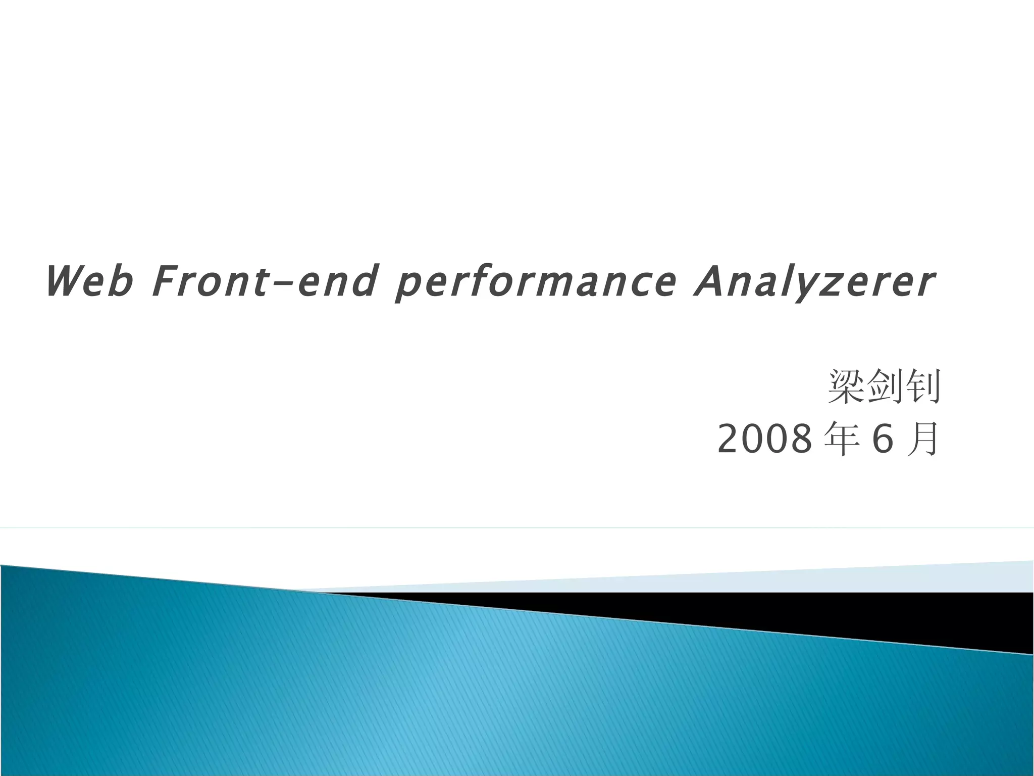 The document discusses front-end web performance analysis. It introduces several popular tools for front-end performance analysis such as Fiddler, IBM Page Detailer, FireBug, YSlow, and AOL PageTest. It then discusses Yahoo's 14 rules and 20 new best practices for high performance web pages. Finally, it discusses techniques for extending front-end analysis tools and principles of optimization.