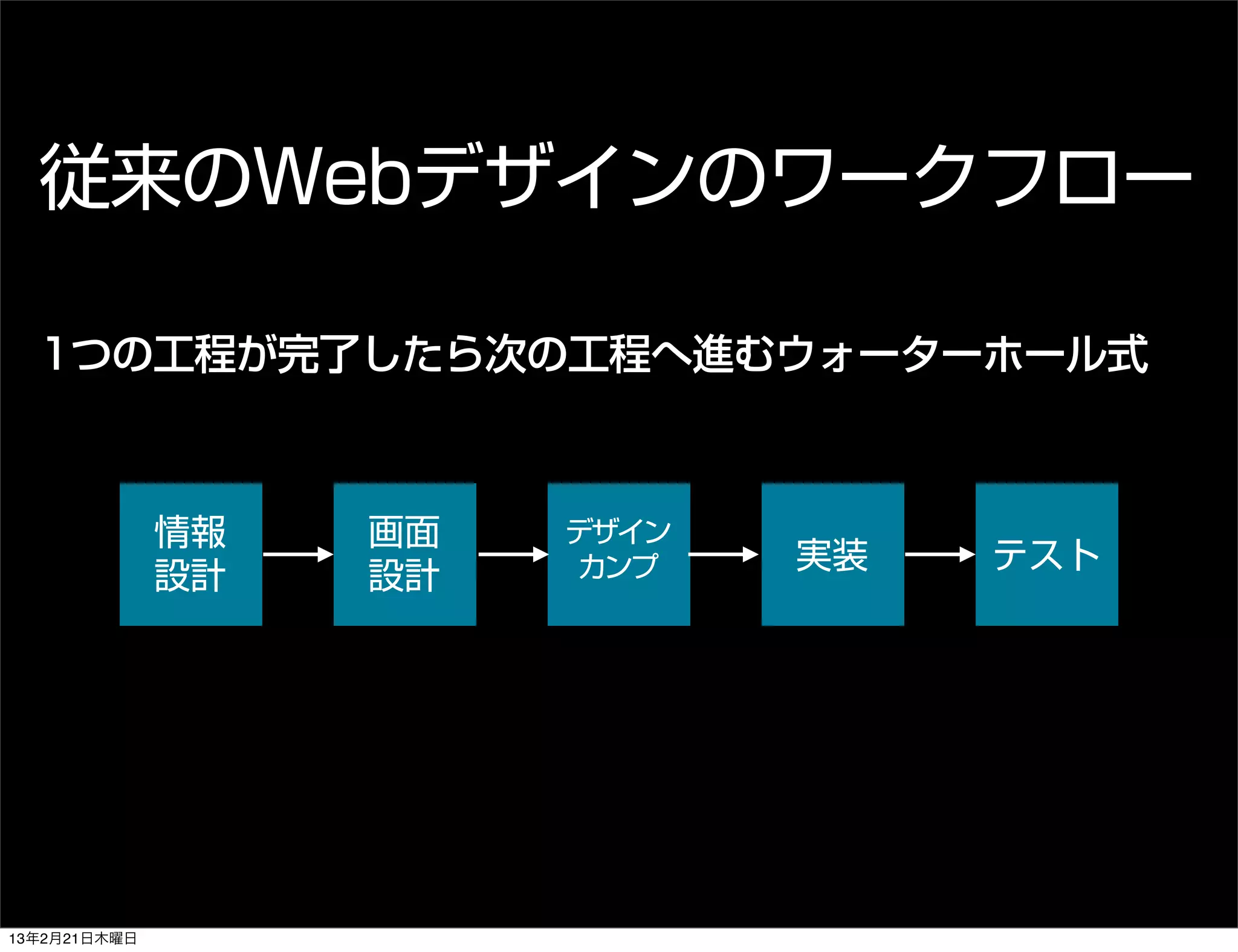テストを重ねて問題に早めに対応できるワーク フローで進める必要がある - 各工程も従来のサイト制作とは方法や考え方が 異なる点が幾つかある 13年2月21日木曜日