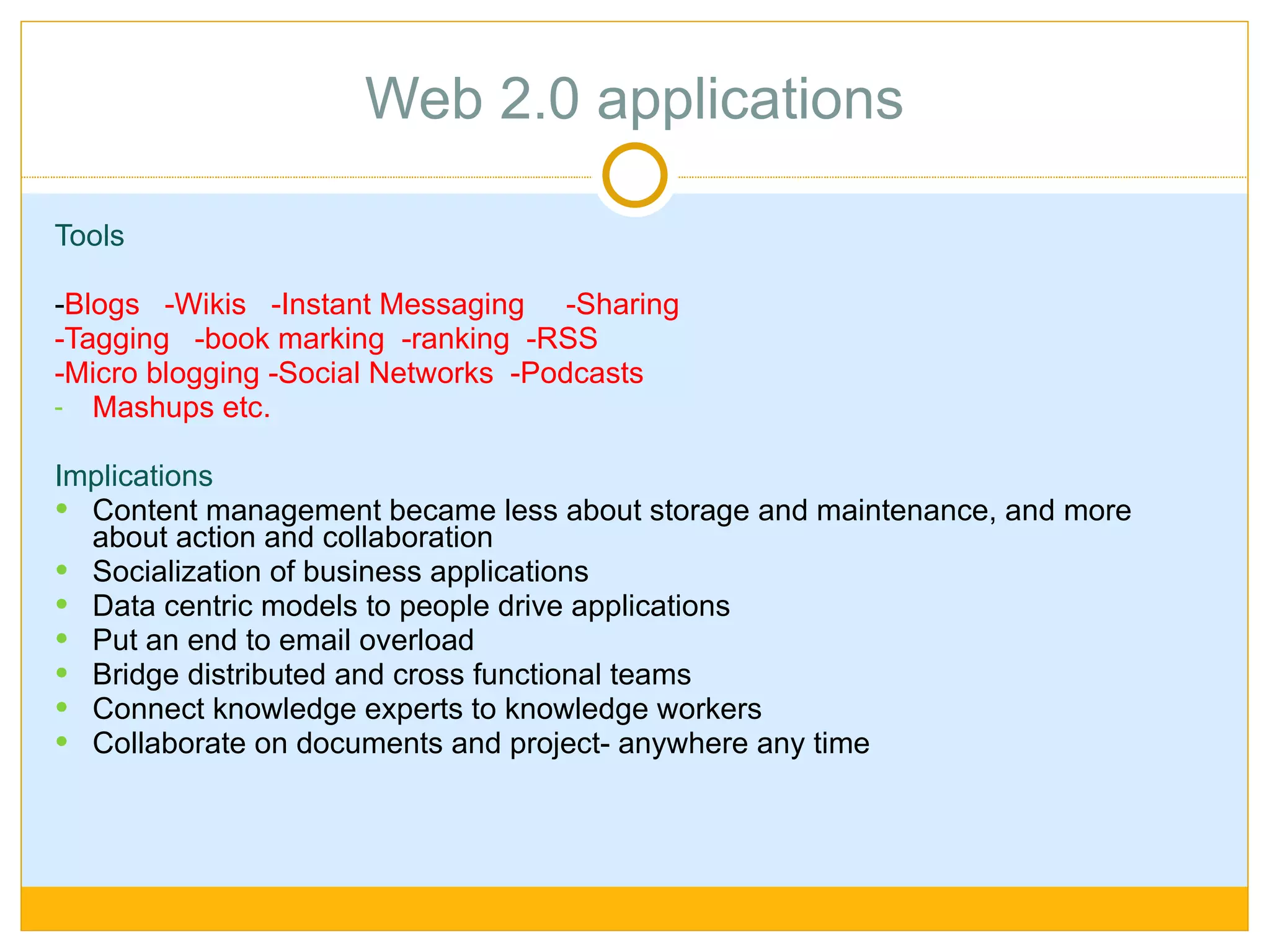 Web 2.0 emphasizes culture, participation, openness and sharing over technology. It is a platform for developing open standard applications and mashups that allows users to add value and co-create content rather than just publish it. While Web 1.0 focused on content management and directories, Web 2.0 enables content reappropriation, tagging, and harnessing collective intelligence through tools like blogs, wikis and social networks.
