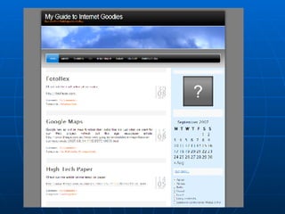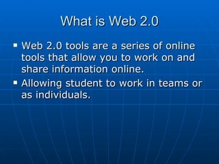 This document lists and provides brief descriptions of various Web 2.0 online tools that can be used for education. These include blogs for sharing resources; bookmarking tools like Delicious; drawing tools like Gliffy; mind mapping tools like Mindomo; presentation sharing on SlideShare; video resources on TeacherTube and SchoolTube; issue exploration with Trackstar; rubric generation with RubiStar; game and activity creation with ClassTools; slideshow making with FlipTrack; drawing and playback with Imagination Cubed; and photo sharing with Flickr. These tools allow students to work individually or collaboratively online.