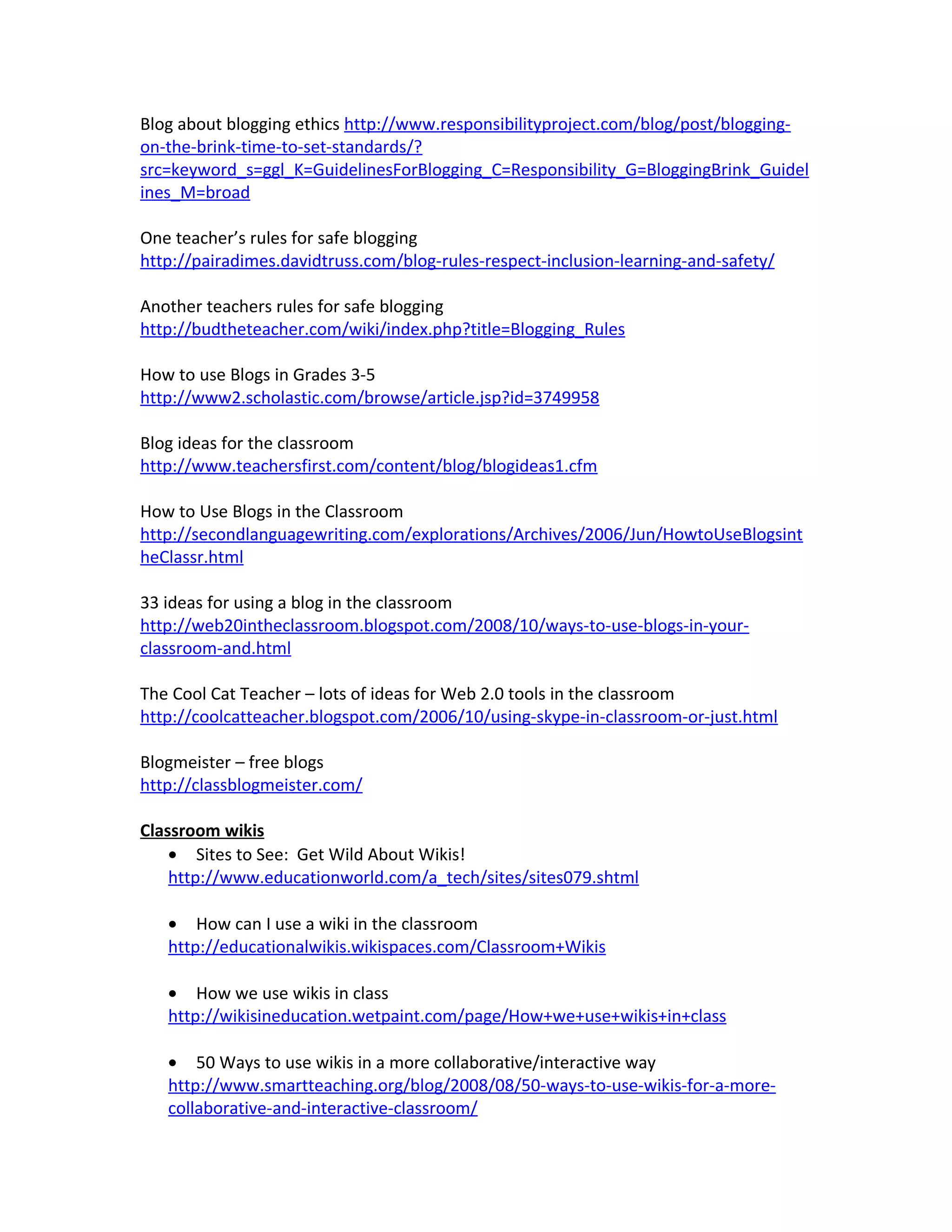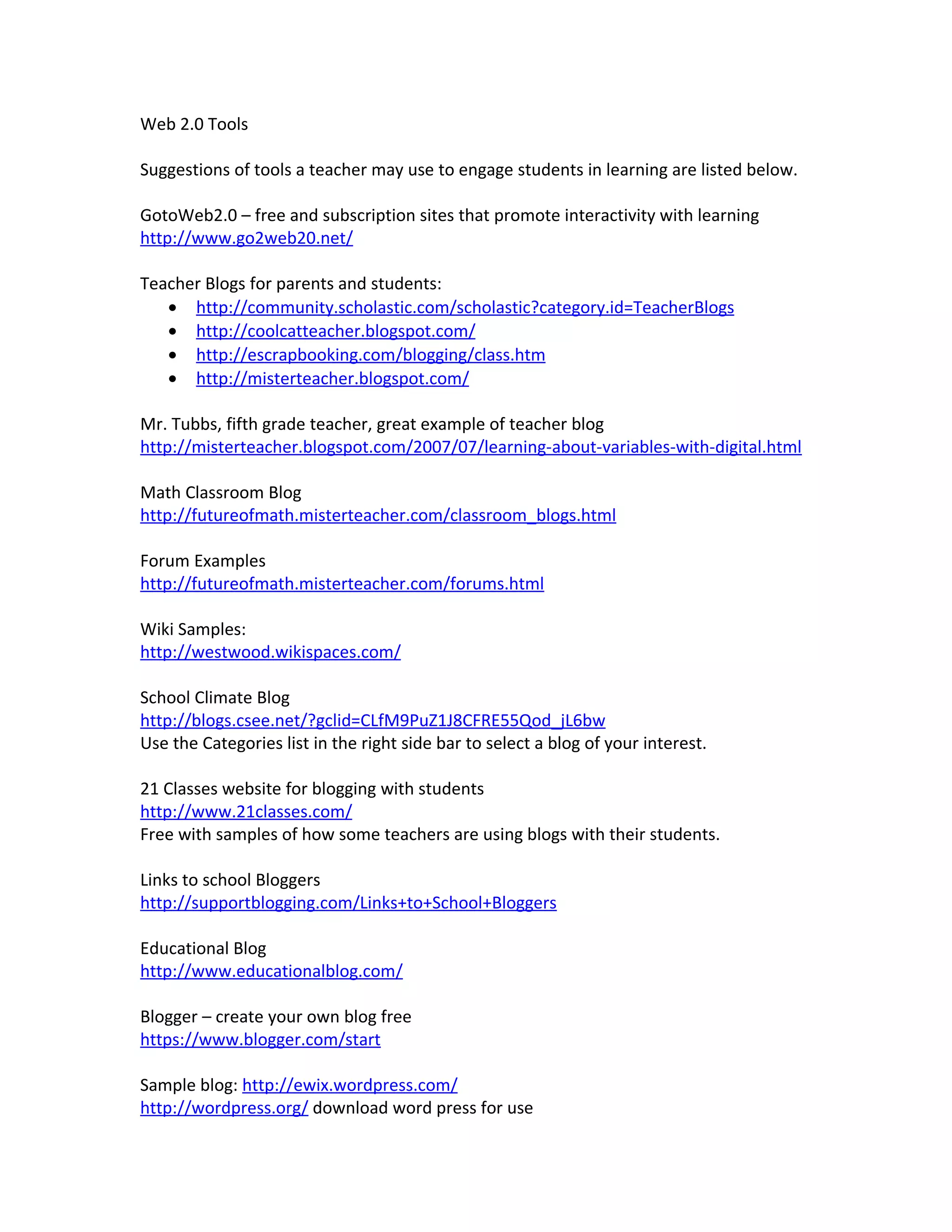 The document lists various Web 2.0 tools that teachers can use to engage students, including teacher blogs, forums, wikis, and bookmarking sites. Examples are provided of how individual teachers are using blogs, wikis, and other tools in their classrooms. A wide range of specific websites and resources are also listed that provide teacher blogs, math blogs, wiki samples, school climate blogs, blog templates, guidelines for safe student blogging, and ideas for using blogs in different grade levels and subject areas.