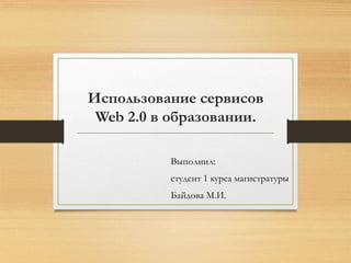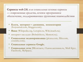 Документ обсуждает использование сервисов Web 2.0 в образовании, включая социальные сети, блоги и вики, подчеркивая их роль в групповых взаимодействиях и совместном обучении. Описываются преимущества и проблемы применения социальных сетей в учебном процессе, а также возможности дистанционного обучения с использованием платформ Google. Подводятся итоги, акцентируя внимание на необходимости активизации познавательной деятельности учащихся и тщательном планировании дистанционных курсов.