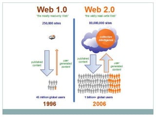 Web 2.0 refers to the transition from static web pages to a more dynamic web allowing users to interact and collaborate. It enables users to connect, share and generate content. The document discusses how Web 2.0 has transformed distance learning by facilitating more interactive and collaborative learning environments compared to traditional one-way delivery of content. Educators are encouraged to incorporate Web 2.0 tools like podcasts, blogs, photo sharing, maps, video and wikis to engage students and support new styles of teaching and learning.
