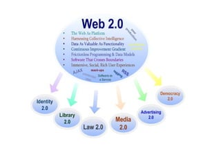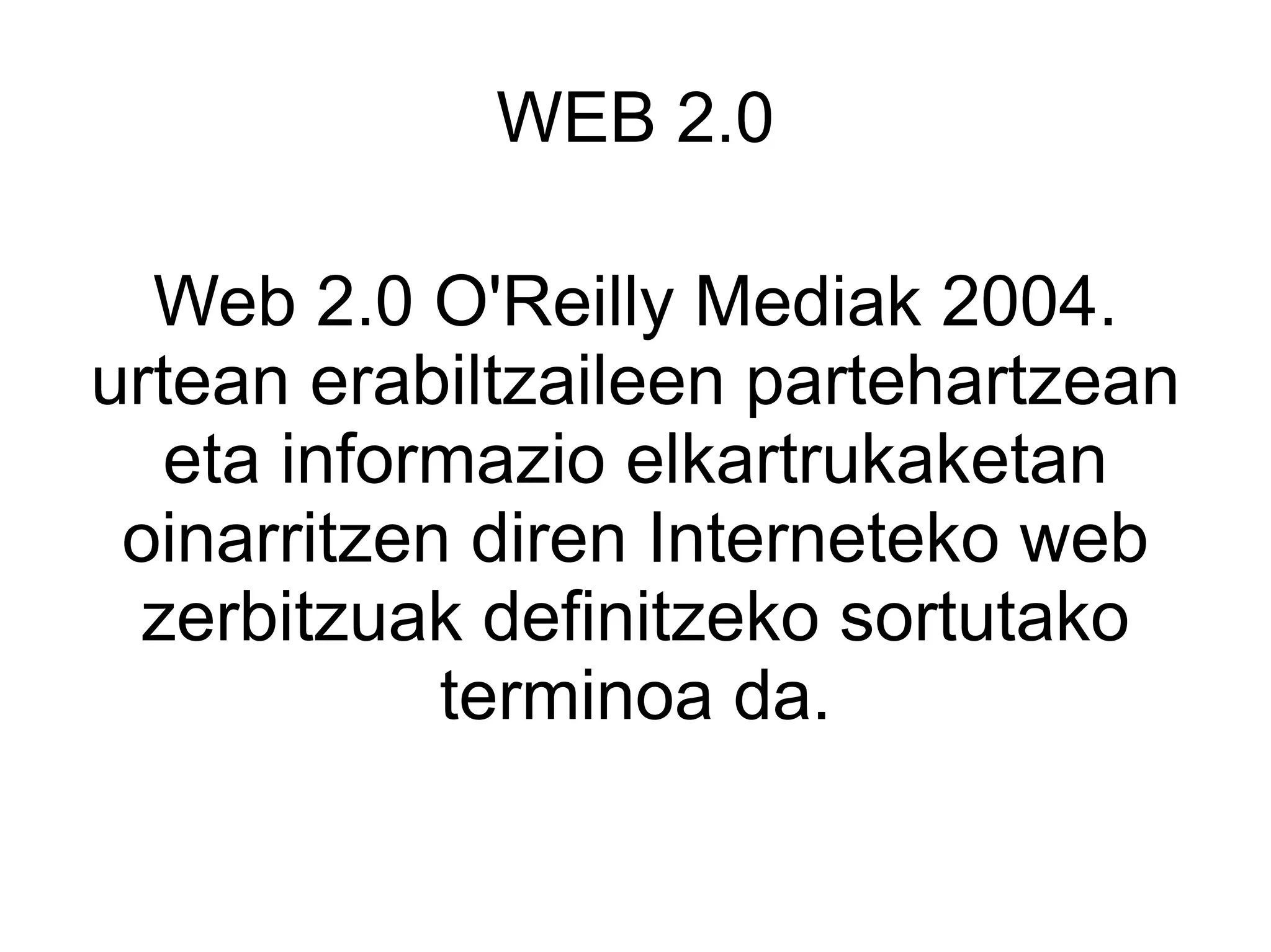 WEB 2.0 Web2.0 O'Reilly Mediak 2004. urtean erabiltzaileen partehartzean eta informazio elkartrukaketan oinarritzen diren Interneteko web zerbitzuak definitzeko sortutako terminoa da.
