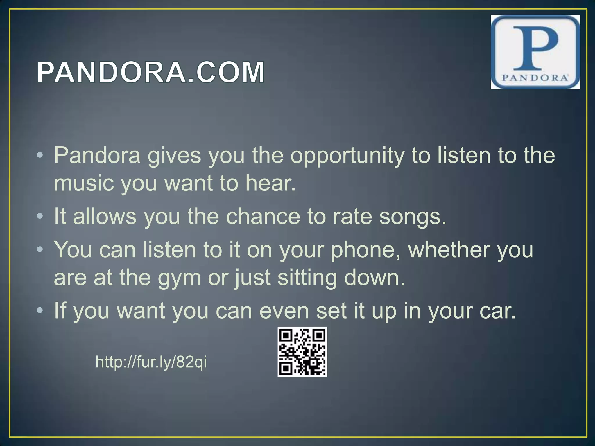 • Pandora givesyou the opportunity to listen to the