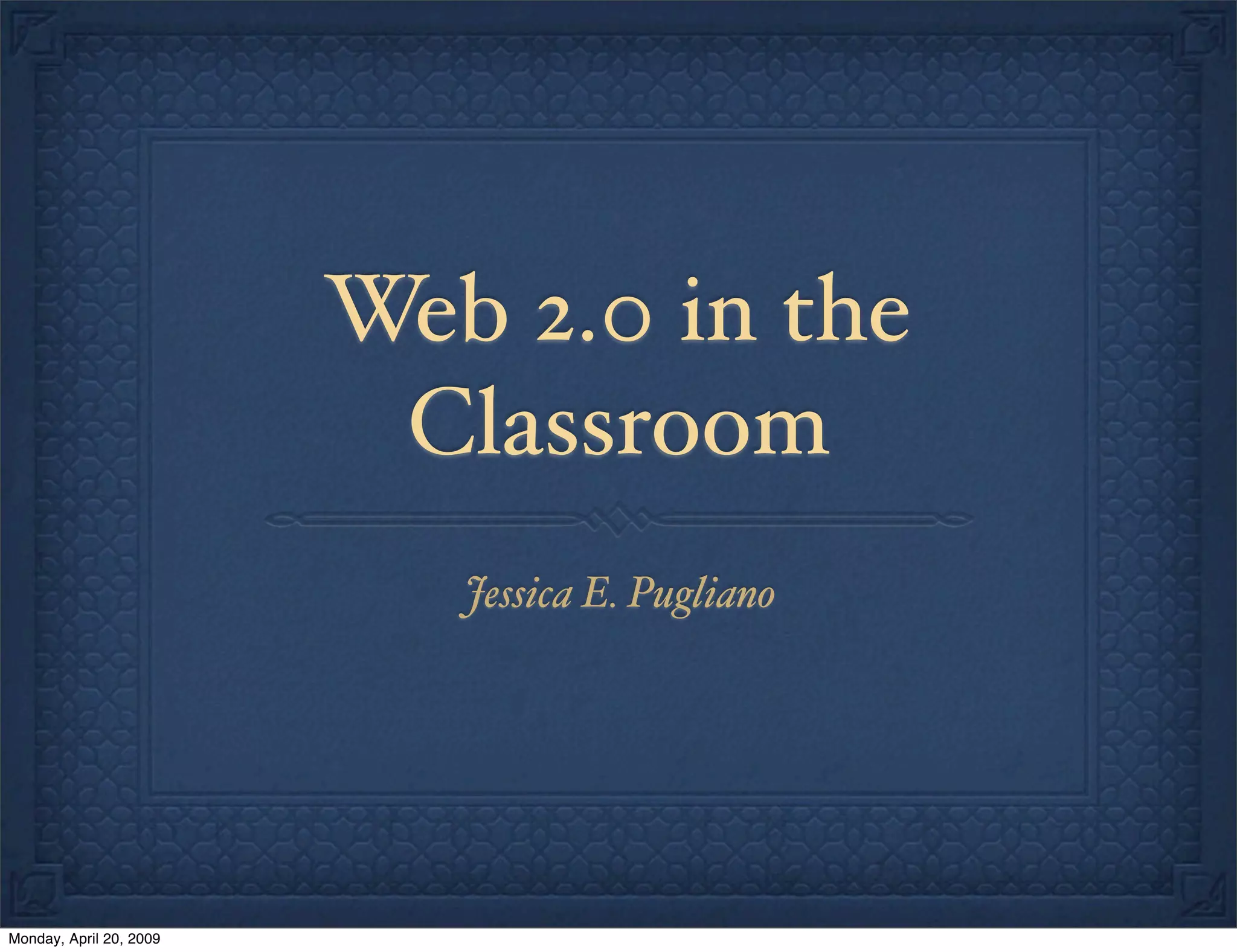 This document discusses using Web 2.0 tools in the classroom. It defines Web 2.0 as focusing on collective intelligence and giving users control over data. Some recommended Web 2.0 tools for classrooms are blogs, wikis, Flickr, SlideShare, and VoiceThread. These tools encourage collaboration and make information globally accessible. While free and engaging for students, Web 2.0 also raises issues about bandwidth usage and ensuring student privacy and safety online.