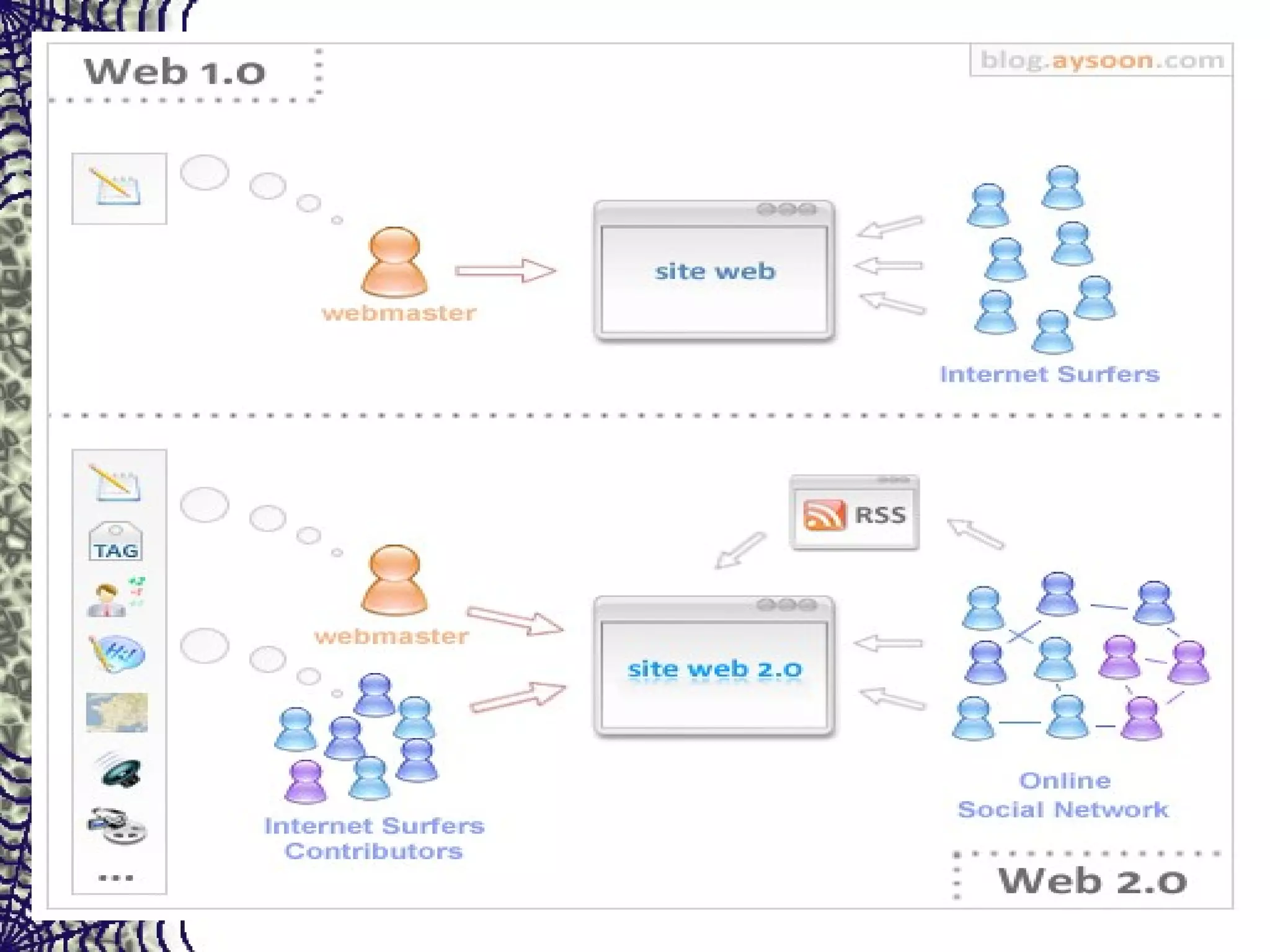 Web 2.0 aims to enhance creativity, information sharing, and collaboration on the World Wide Web through more dynamic and user-generated content. It emphasizes social communication, individual creativity, and allowing users to both read and write content online rather than just download information like earlier versions of the internet. Key differences between Web 1.0 and 2.0 include moving from simply reading content to actively uploading and sharing, and focusing more on social interaction than individual domains.