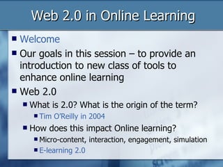 This document provides an introduction to Web 2.0 tools that can enhance online learning. It discusses technologies like Ajax, wikis, blogs, RSS feeds, and social bookmarking/tagging that allow for more dynamic and interactive content. Specific Web 2.0 tools are highlighted like Google Docs, Flickr, YouTube, and social media platforms that can engage students and encourage collaboration.