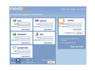 Online toepassingen Meeren meer online toepassingen, steeds minder software op je eigen pc nodig Voorbeelden Documenten : Google Docs – Prezi Chatten : ICQ, MSN - Windows Live Messenger, Yahoo Messenger, Google Talk… Nu : Meebo – Ebuddy