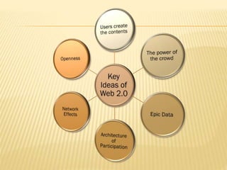 Web 2.0 describes websites that use more advanced technology than earlier static websites, allowing users to create and share their own content. This movement towards user-generated content has both advantages and disadvantages. The "power of the crowd" concept suggests that large groups of people can collectively decide what is best through crowd-sourcing and folksonomy techniques. Web 2.0 encourages community, collaboration and sharing through features like social media platforms. As more people use Web 2.0 tools, their value and ability to connect people increases - boosting the online economy and access to information. Content is generally open for people to share freely on the web.