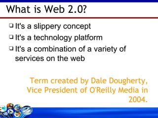 The document discusses the evolution of the web from Web 1.0 to Web 2.0. Web 1.0 consisted of static web pages with users as passive consumers of information, while Web 2.0 is more interactive and dynamic, harnessing user-generated content and collective intelligence through services like blogs, wikis, social networking, and user tagging of content. Web 2.0 applications can be useful for distance learning by facilitating more interactive teaching and learning, academic publishing and research sharing, and data repositories.